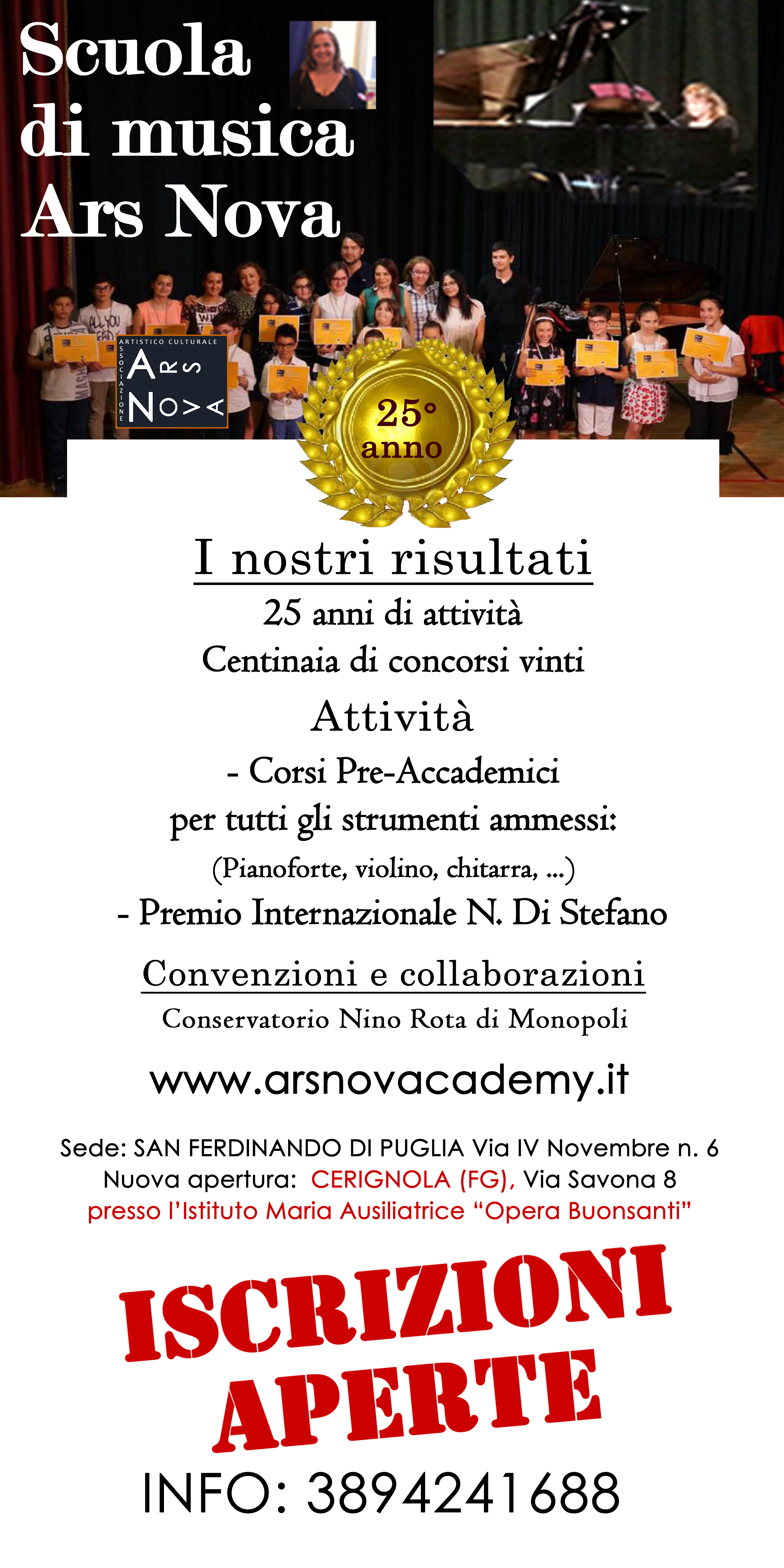 L'ass.ne Ars Nova svolge, in convenzione esclusiva con il Conservatorio "Nino Rota" di Monopoli (BA), corsi preaccademici in tutti gli strumenti musicali.